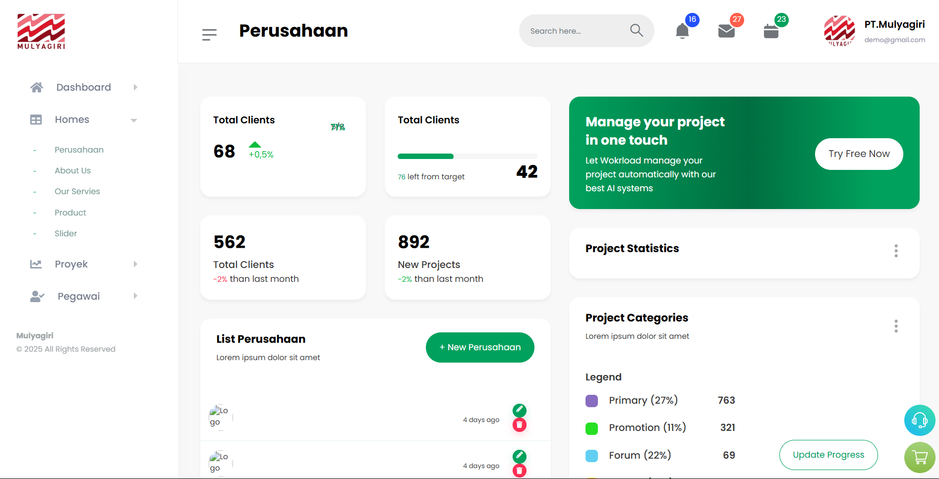 This website is a company management system that includes project management features, client data, and business services. With an interactive dashboard, users can monitor project statistics, add new companies, and manage employees and products efficiently.